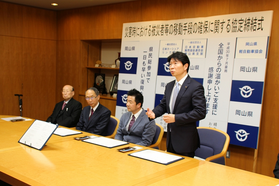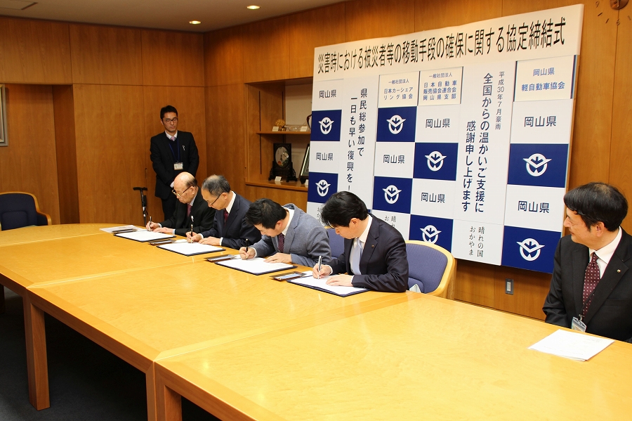 災害時連携協定締結式 〔日本カーシェアリング協会・日本自動車販売協会連合会岡山県支部・岡山県軽自動車協会〕 (13時55分 3階第1会議室) |